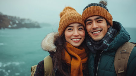 In a winter cityscape, a stylish Chinese couple poses with an air of casual elegance. Their cozy scarves and radiant smiles speak to a chic urban warmth