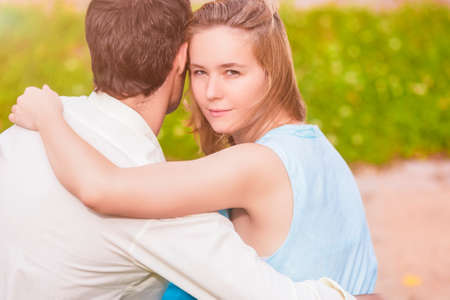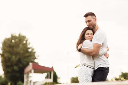 Couple in love having nice time together. Young happy woman hugging her handsome boyfriend. Cheerful casual people students having hopes, dreams goals bride and groom supporting and relying each other