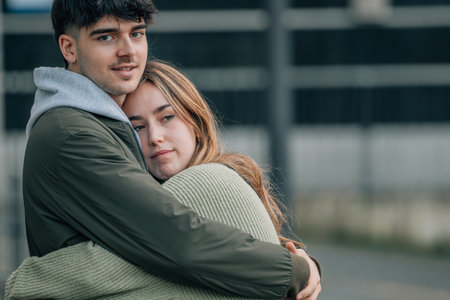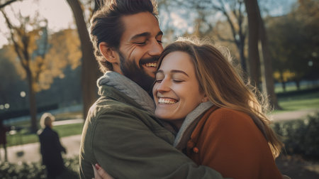 Affectionate couple embracing in a tender hug, showcasing love and connection with a soft-focus background.