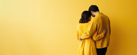 back view of Asian man and woman hugging on yellow background, panoramic shot. Concept National Hugging Day. Banner