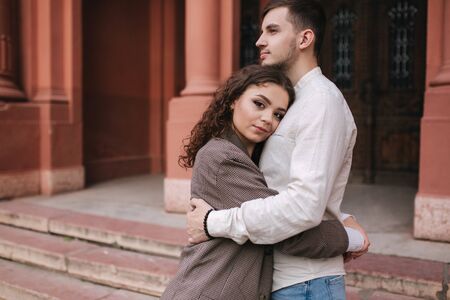 Romantic young couple in love, hugging on the street.