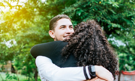 In garden, couple embracing warmly, celebrating joyful moment together outdoors. Romance, love, happiness, relationship, togetherness, nature