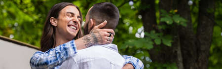 tattooed gay man smiling and hugging boyfriend in summer, banner