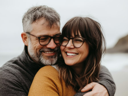 Joyful middle aged couple, a man and woman, sharing a loving hug on a beach - ai