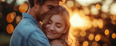 Loving couple embracing outdoors at sunset, conveying warmth and affection.