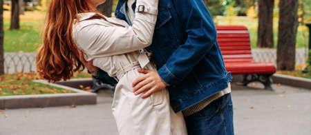 love, relationship, family and people concept - close up of couple the guy tips the girl and kisses, the man is hugging the woman. a pose of love and devotion. amusement park. a guy in jeans and a denim jacket, a girl in a light raincoat