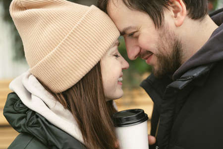 Loving beautiful couple on a winter day. A man hugging his happy woman, drinking hot tea or coffee while walking in the fresh air