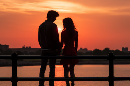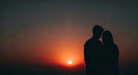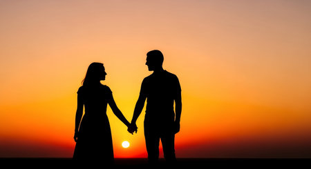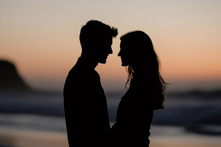 Silhouette of a couple sharing a peaceful moment on the beach with a beautiful sunset in the background