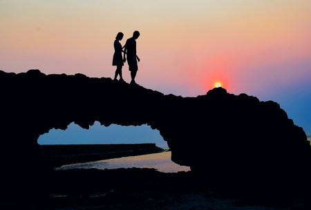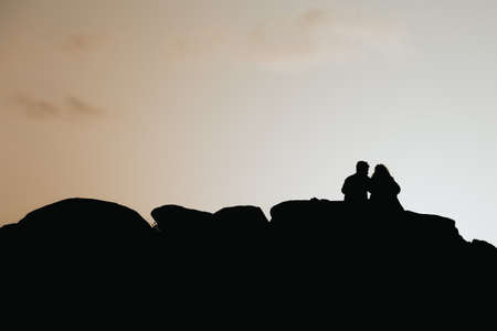 Silhouette of a man and a woman sitting on a cliff at sunset