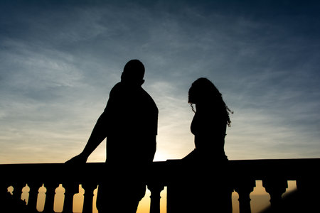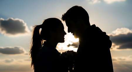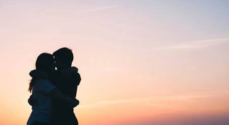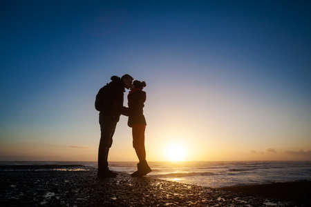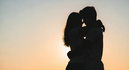 Silhouette of a loving couple at sunset sky background. Love concept.