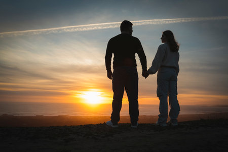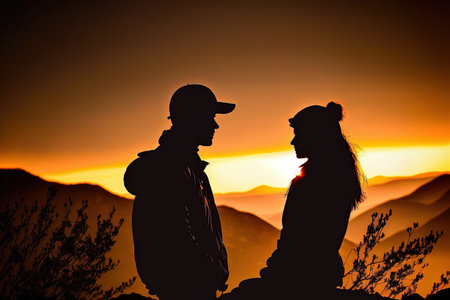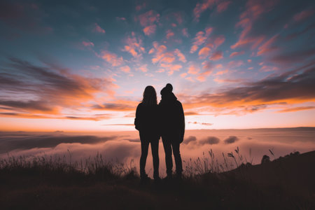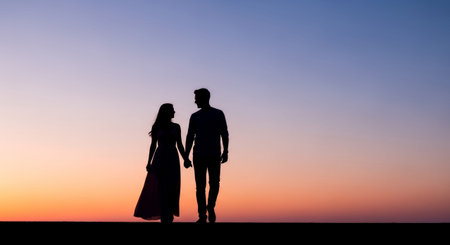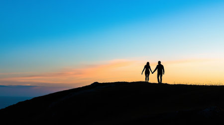 panorama view of couple holding hands on hiking hill, silhouette - ai