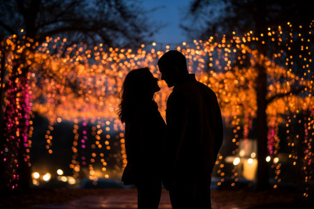 The enchanting silhouette of a couple in love set against the dazzling display of holiday lights