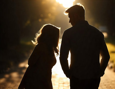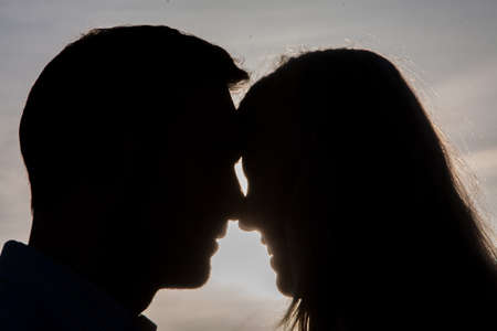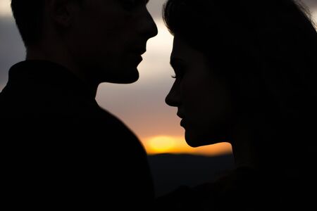 Close-up silhouettes of couple in love on background of sunlight. Action. Loving looks and tenderness of young couple on background of bright sunset sun. Romantic dark silhouettes