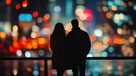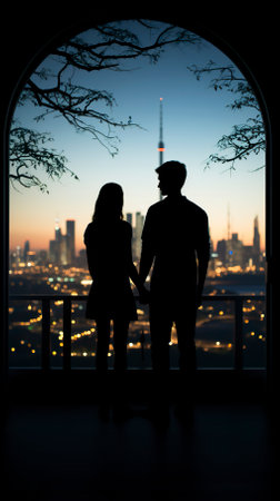 In the midst of the city's nocturnal charm, a couple's silhouette tells the story of their love, framed by the city's sparkling lights