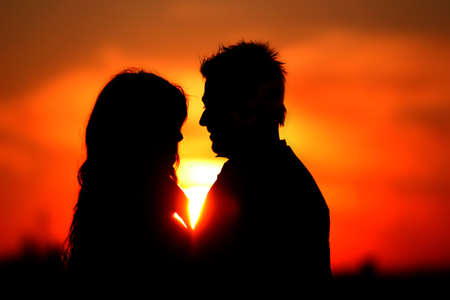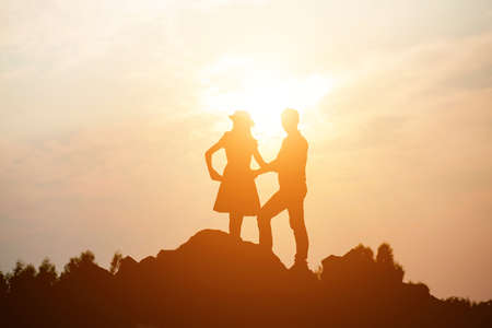 Silhouette of two people in love against the backdrop of the setting sun. Romance in relationships and nature