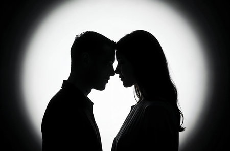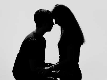 black and white silhouettes of portraits men and women on white background stand opposite each other, touching their foreheads. feminism, masculism concept