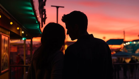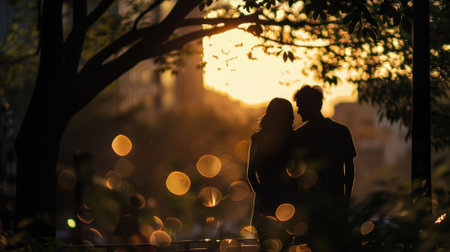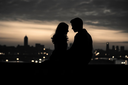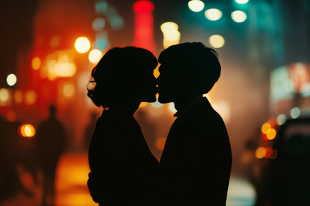 A captivating urban love story unfolds as the silhouette of a couple embraces against the backdrop of the city's dazzling nighttime brilliance