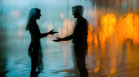 Closeup of a handshake captured midaction with subtle reflections on the glass surface beneath as blurred silhouettes of two participants engage in focused conversation emphasizin