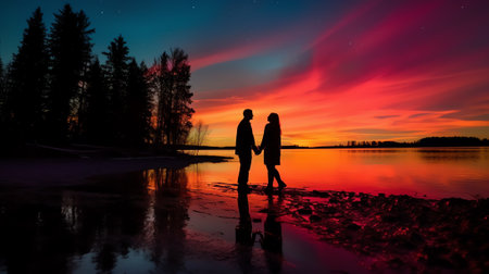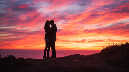 breathtaking image capturing the silhouette of a couple embracing against a vibrant sunset.