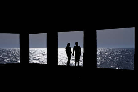 couple in love in the sunset beach - silhouette of young lovers in sunset light