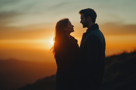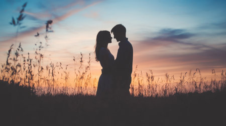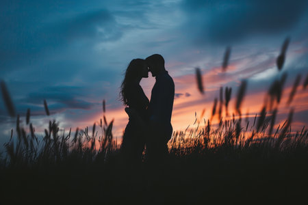 A romantic silhouette of a couple embracing at sunset, with tall grass framing them. The warm colors of the sky create a serene and intimate atmosphere.