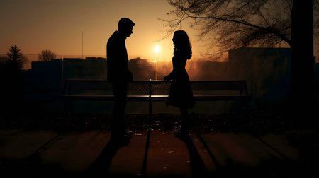 Silhouetted couple sharing a tender moment at sunset near a park bench.