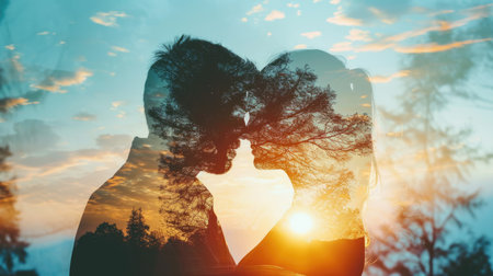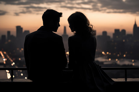 A double exposure of a loving couple's silhouette intertwined, with towering city skyscrapers illuminated at dusk, blending the softness of human connection with the urban skyline's strength and modernity.