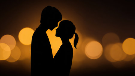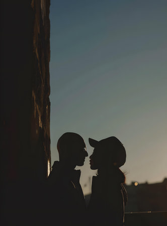 Romantic Silhouette of an Interracial Couple Kissing Against Warm Light Backdrop Creating Emotional Connection and Love. Valentine's Day.