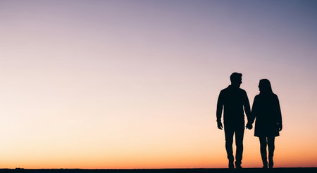 A romantic scene featuring a couple holding hands, silhouetted against a vibrant sunset sky filled with rich colors, evoking feelings of love and tranquility.