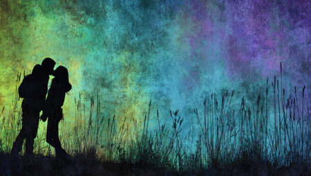 Romantic scene featuring the silhouettes of a couple kissing in a field of tall grasses. The background depicts a textured sky in a mix of vibrant colors.