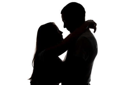 double exposure of couple in love, affectionate man and woman, dating, silhouettes on white background