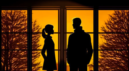 Silhouette of man and woman looking out the window at sunset. Generative AI.