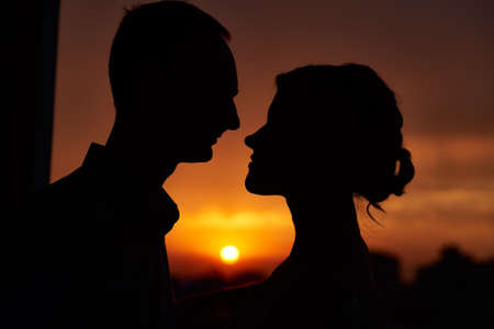 Silhouetted loving couple at sunset. Lovers guy and a girl.