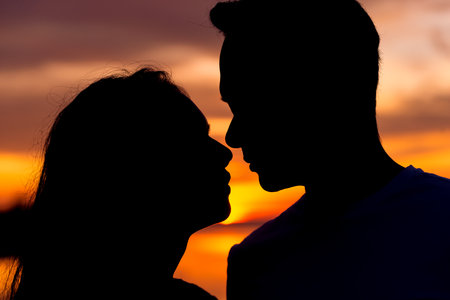 Silhouette of young couple kissing on sunset sky background. Love concept