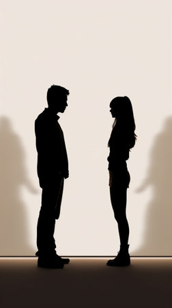 Silhouetted couple man and woman stands close in dramatic backlight, foreheads nearly touching. A moody, intimate moment of love, connection, and emotion captured in soft shadow and glow.