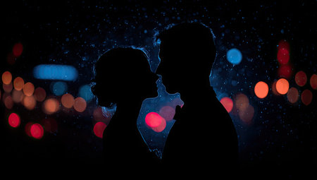 Close-up silhouette of a couple sharing a moment of intimacy at night, set against a backdrop of out-of-focus city lights and bokeh. The image is dramatic and romantic.