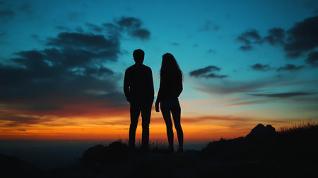 Silhouetted couple stands together, gazing at a vibrant sunset landscape.
