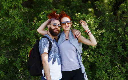 Portrait of a man and a woman in sunglasses in the woods. Young stylish couple on the background of nature. Warm autumn evening in the forest. Horizontally framed shot.