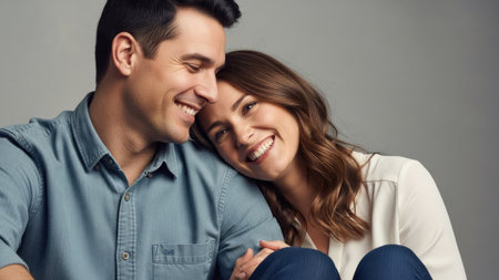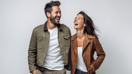 This studio portrait features a laughing couple, illuminated by soft lighting against a plain backdrop. The composition highlights their positive emotions through facial expressions, offering a sense of connection. The image can be used for various commercial purposes, including marketing or editorial content focusing on relationships and happiness.