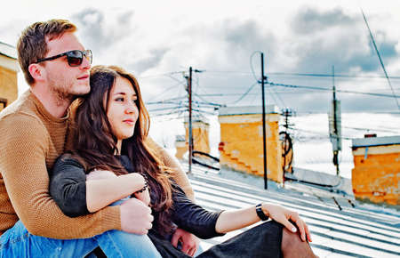 Portrait of a young couple having fun on the roof at sunset.
