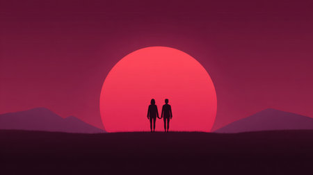 A captivating silhouette of a couple holding hands as they gaze at a stunning sunset, with a large pink sun setting behind serene mountains, evoking feelings of love and tranquility.