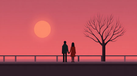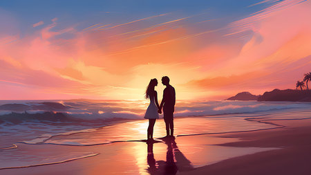 A minimalistic digital artwork depicting a romantic couple holding hands at sunset on a serene beach. Silhouetted trees and a vibrant sky enhance the atmosphere, creating a peaceful and tender moment.