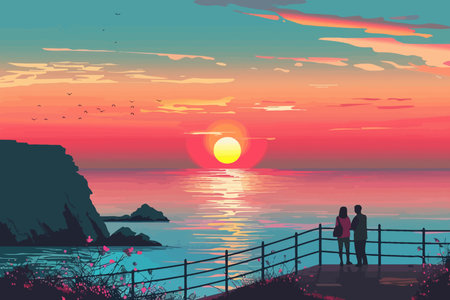 A couple stands by a railing, admiring a vibrant sunset over the ocean. Flat vector illustration.