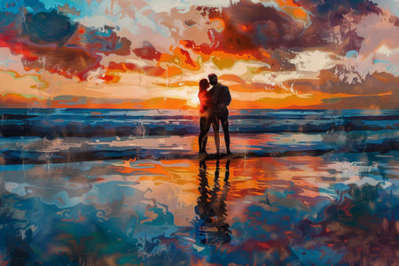 A couple is kissing on a beach at sunset. The painting is a beautiful representation of love and romance