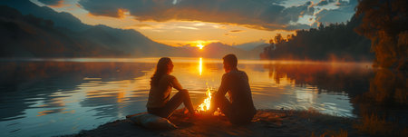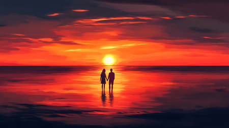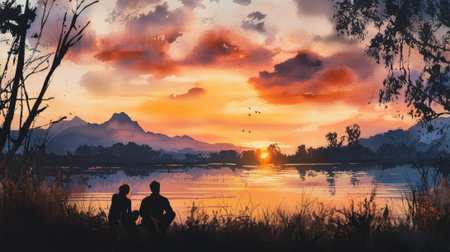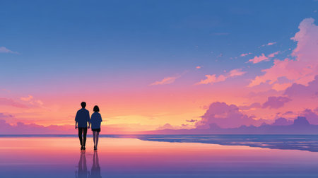 Two figures are seen silhouetted against a vibrant sunset. The composition features a mirror-like water surface reflecting the warm hues of the sky, with shades of orange, pink and yellow. The style is soft, with an emphasis on light and shadow. Suitable for various creative and commercial applications.