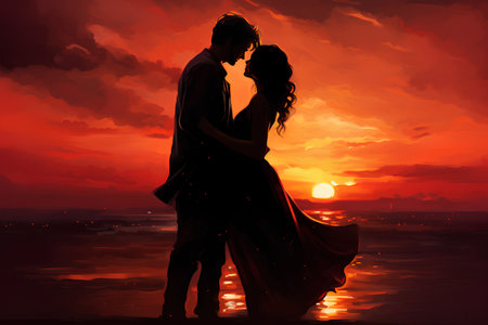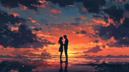 Captivating silhouette of a couple sharing a romantic moment at sunset. The vibrant skies and tranquil waters create a dreamlike atmosphere, perfect for conveying love and connection.