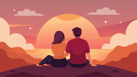A couple is sitting on a blanket and watching the sunset. The sky is orange and pink, and the sun is setting behind the mountains. Scene is romantic and peaceful