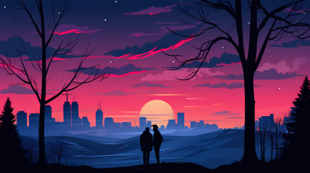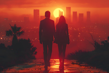 Romantic Sunset Silhouette of Couple Overlooking Cityscape