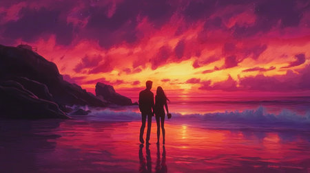 A couple stands on beach at sunset, silhouetted against vibrant colors in sky. waves gently lap at their feet, creating romantic and serene atmosphere