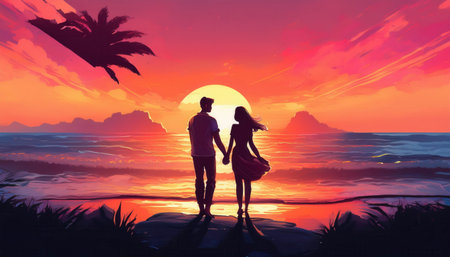 A beautifully illustrated silhouette of a couple at sunset, surrounded by palm trees and a vibrant ocean view, evoking feelings of romance and serenity.